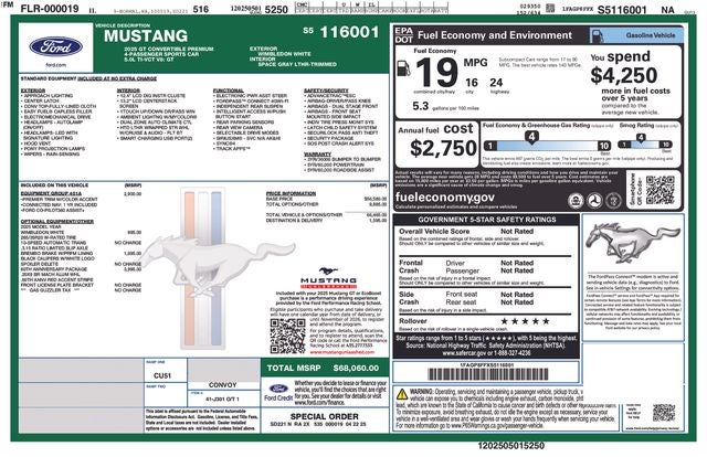 Boasting a meticulously curated list of features, this Mustang GT Premium is a true masterpiece. Enjoy the convenience of Apple CarPlay and Android Auto, seamlessly integrating your digital life with the vehicle's advanced infotainment system. The 60th Anniversary Package adds a touch of exclusivity, with a painted body-color mirror caps, a unique anniversary badge, and striking 20-inch bright machined aluminum wheels.