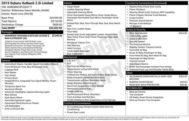 Discover the perfect balance of rugged capability and refined comfort with this 2015 Subaru Outback 2.5i Limited. Boasting a striking Wilderness Green Metallic exterior, this exceptional SUV is primed to take you on all of life's adventures.
