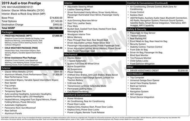 Elevate your driving experience with this exceptional 2019 Audi e-tron Prestige quattro. This all-electric SUV combines the renowned performance and luxury of the Audi brand with the efficiency and environmental benefits of an electric powertrain. From its sleek, aerodynamic exterior to its meticulously crafted interior, this e-tron is a true testament to Audi's engineering excellence.