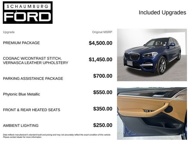 The interior of this X3 is equally impressive, with Vernasca Leather upholstery in a rich Cognac color, complemented by Ambient Lighting and the convenience of Heated Front Seats. The spacious cabin offers ample room for passengers and cargo, making it the perfect companion for your daily commute or weekend adventures.