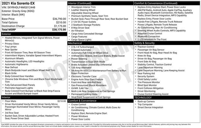 Discover the perfect blend of style, performance, and versatility with this 2021 Kia Sorento EX. This exceptional SUV offers an unparalleled driving experience, thanks to its powerful 2.5L I4 DGI Turbocharged engine that delivers an impressive 281 horsepower. Paired with an 8-Speed DCT and Kia's advanced All-Wheel Drive system, this Sorento EX provides the perfect balance of power and efficiency, with an EPA-estimated 21 city/28 highway MPG.