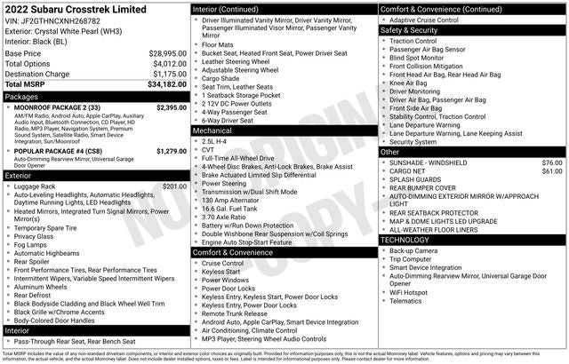 Discover the Subaru Crosstrek Limited - a versatile and capable crossover that's ready to elevate your driving experience. With its striking white exterior, this 2022 model boasts a refined 2.5L 4-cylinder engine, delivering a remarkable blend of power and efficiency with an EPA-estimated 27 city/34 highway MPG.