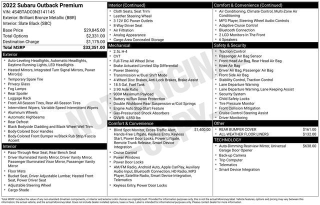 The Outback Premium's 2.5L 4-cylinder DOHC 16V engine, paired with Subaru's renowned Lineartronic CVT and Symmetrical All-Wheel Drive, delivers an exceptional balance of power and efficiency. With an EPA-estimated 26 MPG in the city and 33 MPG on the highway, this SUV offers the versatility you need without sacrificing fuel economy.